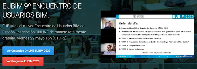 - El esquema del encuentro al que podéis acceder, contaba con la clásica presentación de Alberto Cerdán y Alvaro Sánchez Palma contando que es EUBIM y que es la Red de Grupos de Usuarios de España con el calendario y el mapa, seguido de la presentación del libro de actas que si se ha realizado del congreso EUBIM 2020 con las comunicaciones presentadas y valoradas por el comité científico.